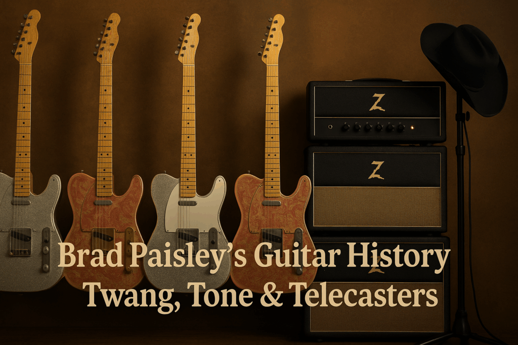 Few modern country guitarists have carried the torch of twangy virtuosity quite like Brad Paisley. Known for his lightning-fast chicken pickin’, signature Telecaster tones, and genre-defying finesse, Paisley’s guitar history is a journey through vintage tone, technical mastery, and personal innovation. From his earliest gigs in West Virginia to headlining arenas with a stack of Dr. Z amps behind him, Paisley has become a gear icon in his own right.