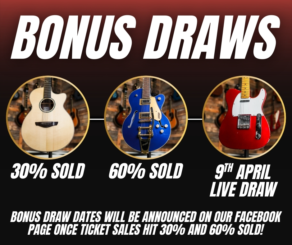 Bonus draws – when ticket sales hit 30% sold we will draw a winner for the Faith Hi Gloss Venus, and at 60% sold we will draw a winner for the Gretsch Electromatic! Bonus draw dates will be announced on our Facebook page.
