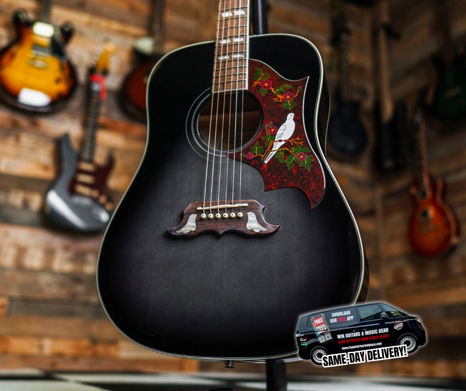 The Epiphone Dove Studio in Transparent Ebony Burst captures the elegance of the original Gibson Dove with modern playability and amplified power. Boasting a classic squareβshoulder dreadnought shape and sparkling Fishman Sonitone electronics, it delivers a rich, articulate voice both unplugged and on stage.