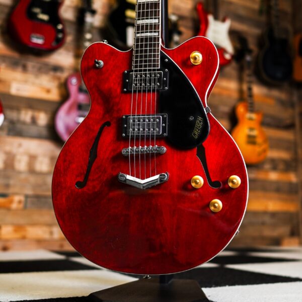 The J-200 EC pays homage to the ‘king of the flat-tops’ – the classic Gibson SJ-200. This model features a cutaway ‘Super Jumbo’ body with select Maple back and sides, a Solid Spruce top for outstanding tonal clarity, and a smooth-playing hard Maple neck with a ‘SlimTaper’ D-shaped profile, Pau Ferro fretboard, 20 medium jumbo frets, and classy Pearloid crown inlays. The bridge has the legendary ‘mustache’ shape and the pickguard features iconic J-200 graphics. Comes equipped with a Fishman Sonicore under-saddle pickup and Presys preamp with a built-in tuner.