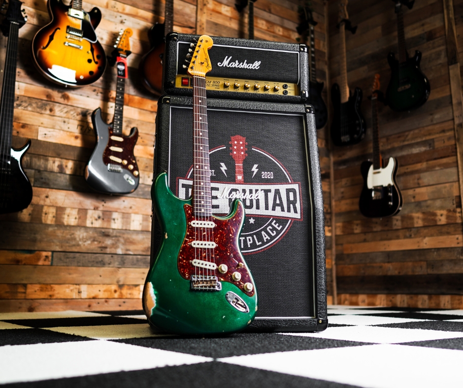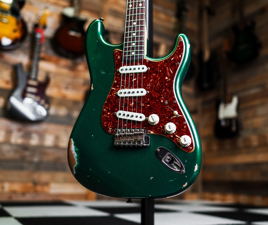A Fender Custom Shop β63 Stratocaster Relic in Mystic Pine Green replicates the feel and tone of a 1963 Strat with premium appointments and master-built consistency. It features alder body, quartersawn maple neck, Custom Shop handwound β60/63 Strat pickups, and an aged nitro finishβperfect for players chasing vintage vibe with modern playability.