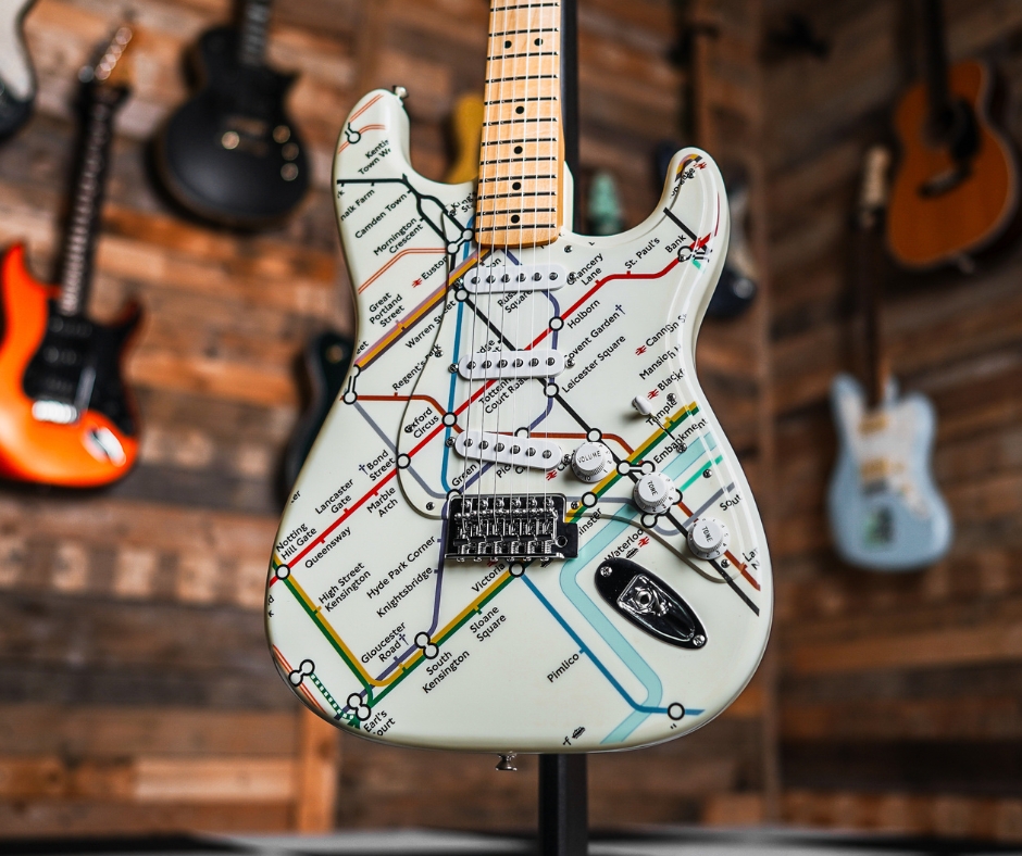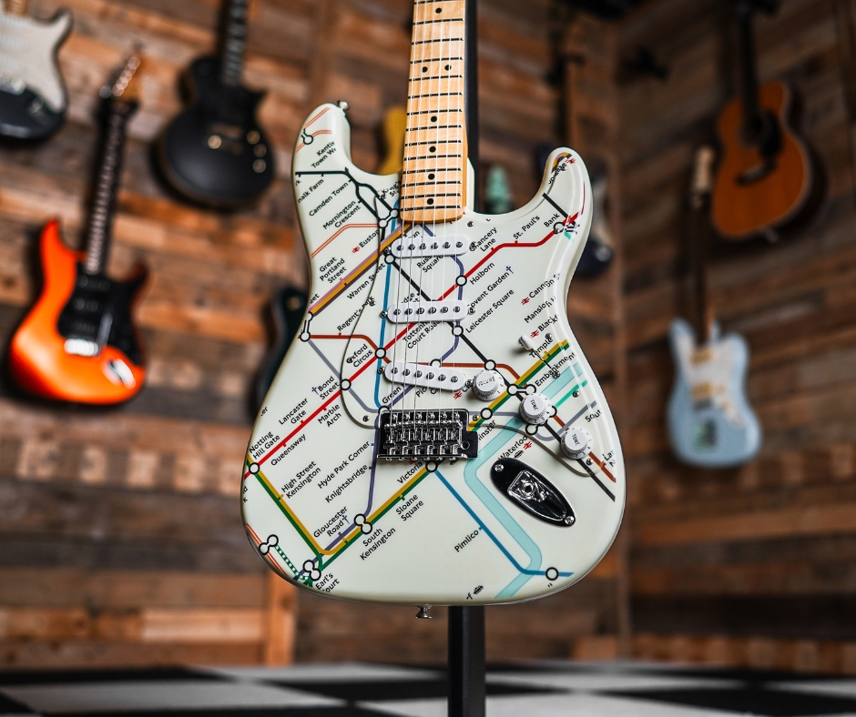A limited‑edition Fender Stratocaster celebrating London’s iconic Underground system, finished in Olympic White with a London Tube Map graphic on the body and Transport for London branding on the neck plate and headstock area. Based on a standard Mexican Stratocaster platform, it offers classic Strat tone and feel with eye‑catching, collectible style tied to the Tube map artwork.