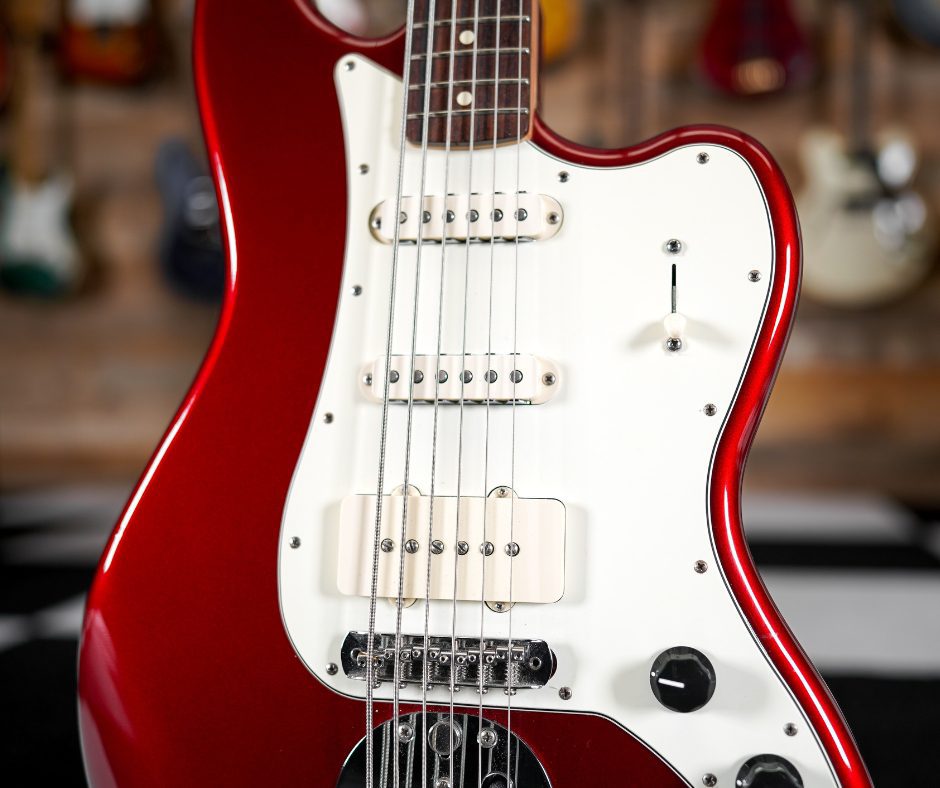 The Pawn Shop Bass VI marks the revamped return of a historic Fender instrument, the seldom-seen Fender Bass Guitar (also known as the Bass VI) of 1961-1975. This updated version of the baritone classic features the traditional short scale (30β³) and is armed with Special Design Hot Jaguar single-coil neck and middle pickups and a powerful JZHB humbucking bridge pickup.