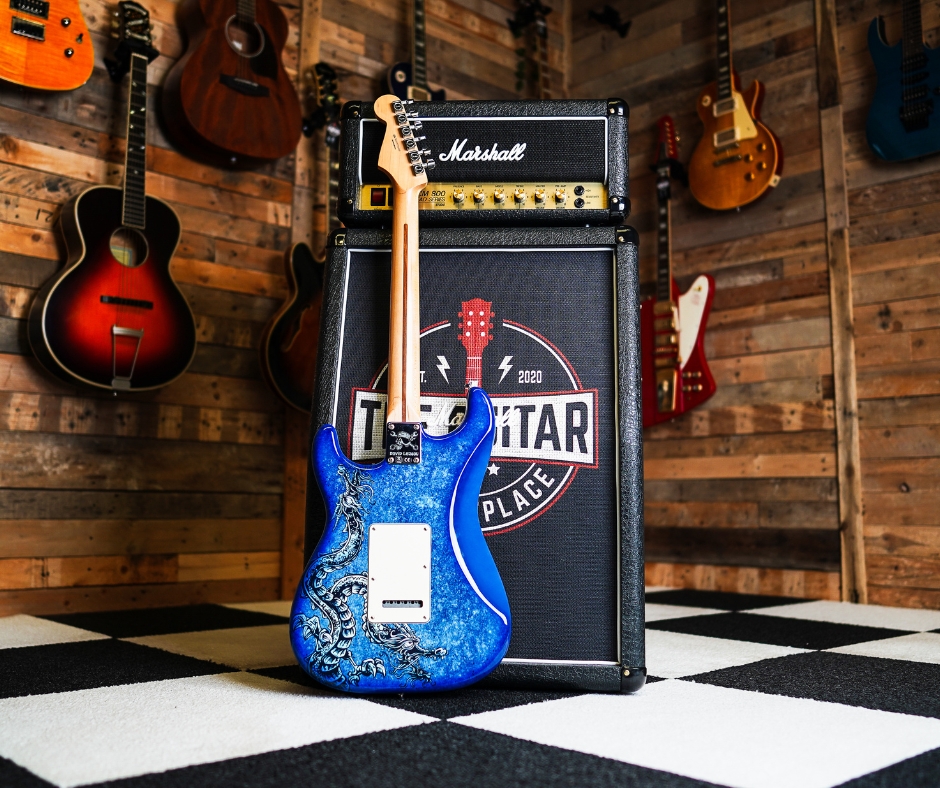 The Fender Special Edition David Lozeau Art Stratocaster “Dragon” is a visually arresting, limited-run instrument that fuses classic Fender playability with the high-octane “Lowbrow” art of renowned artist David Lozeau. Part of a 2015 special series, this model features a custom “Dragon” wrap that brings a vibrant, tattoo-inspired aesthetic to the iconic Stratocaster body.