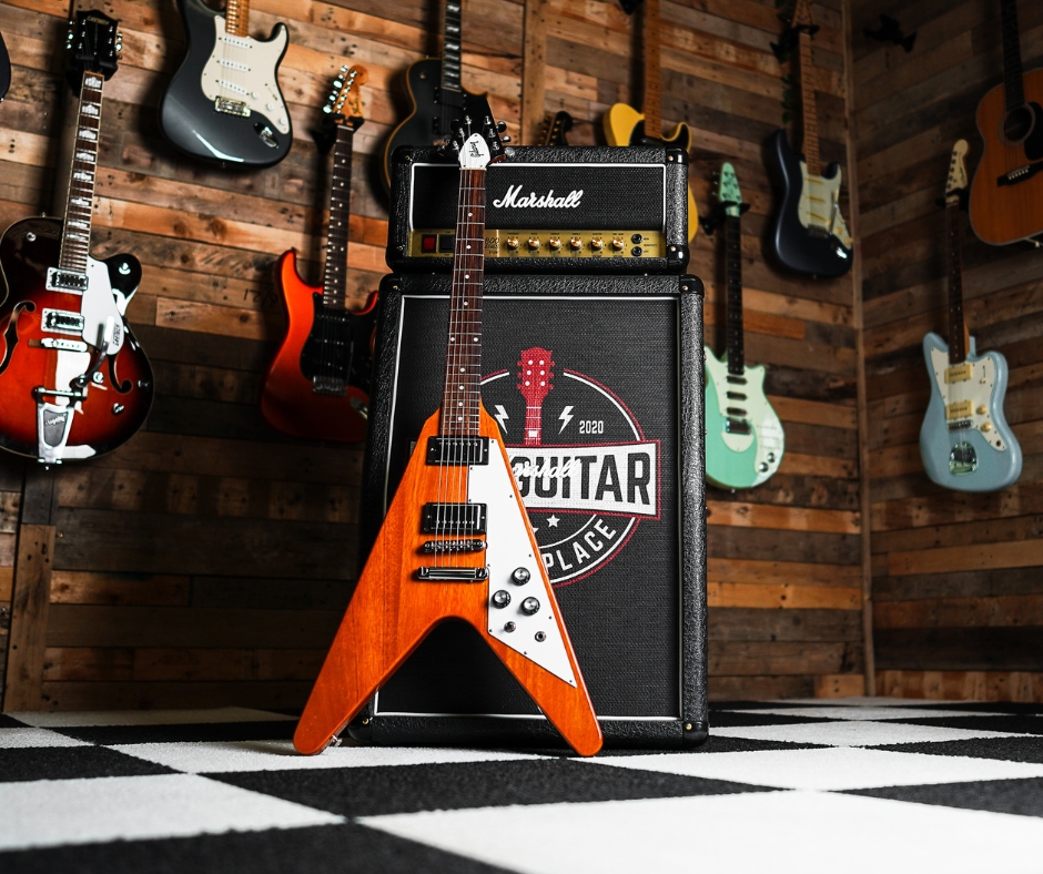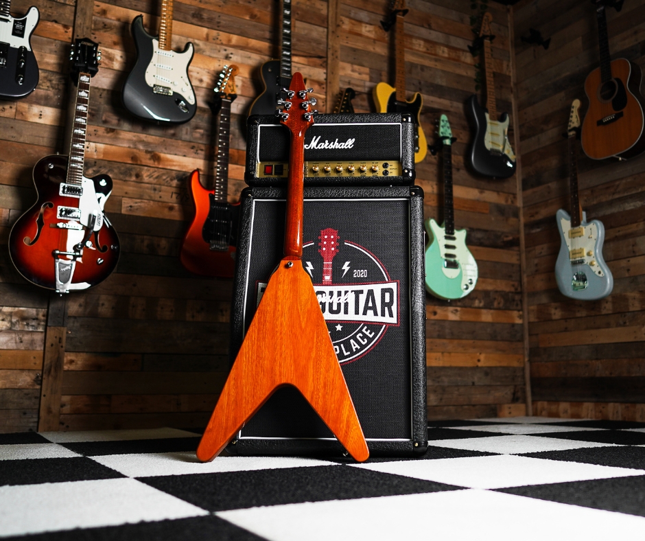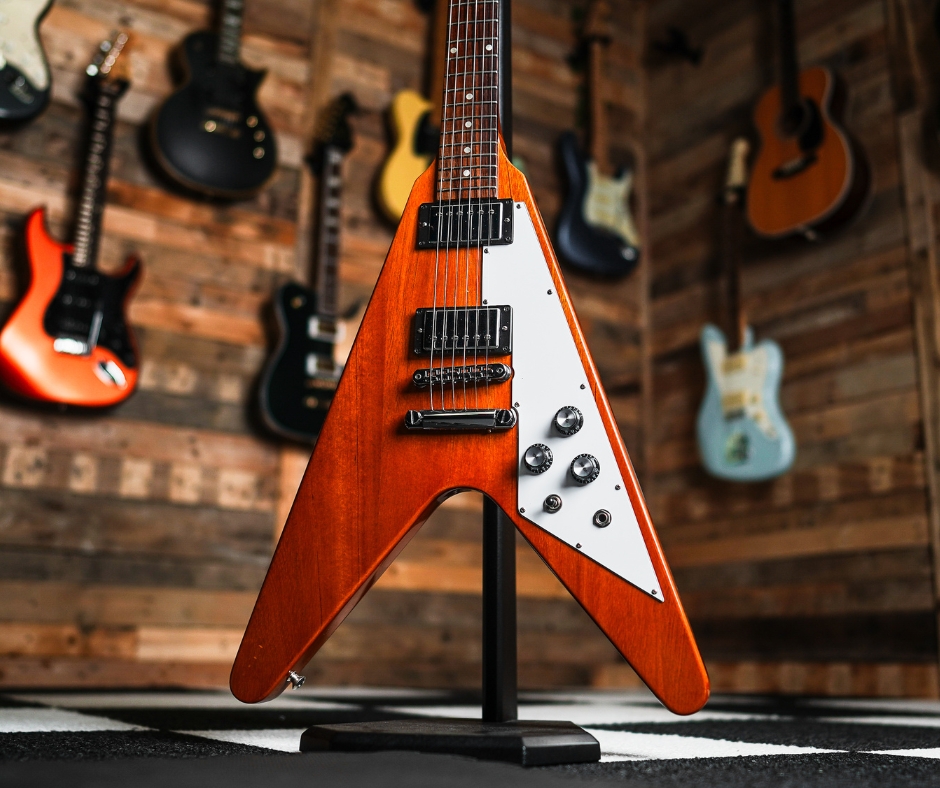 The Gibson Flying V in Antique Natural is a striking blend of vintage aesthetics and high-output performance, featuring a solid mahogany body and neck for unparalleled resonance and sustain. This modern classic is equipped with a BurstBucker 2 and 3 pickup set, delivering a perfect mix of PAF-style clarity and aggressive “Flying V” bite.