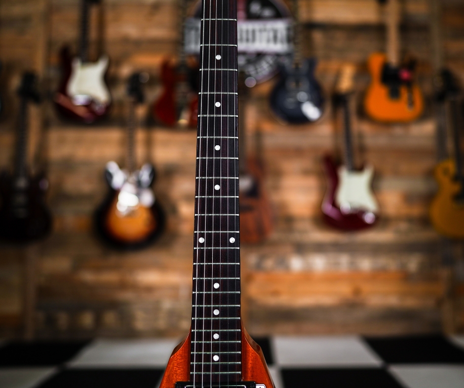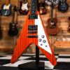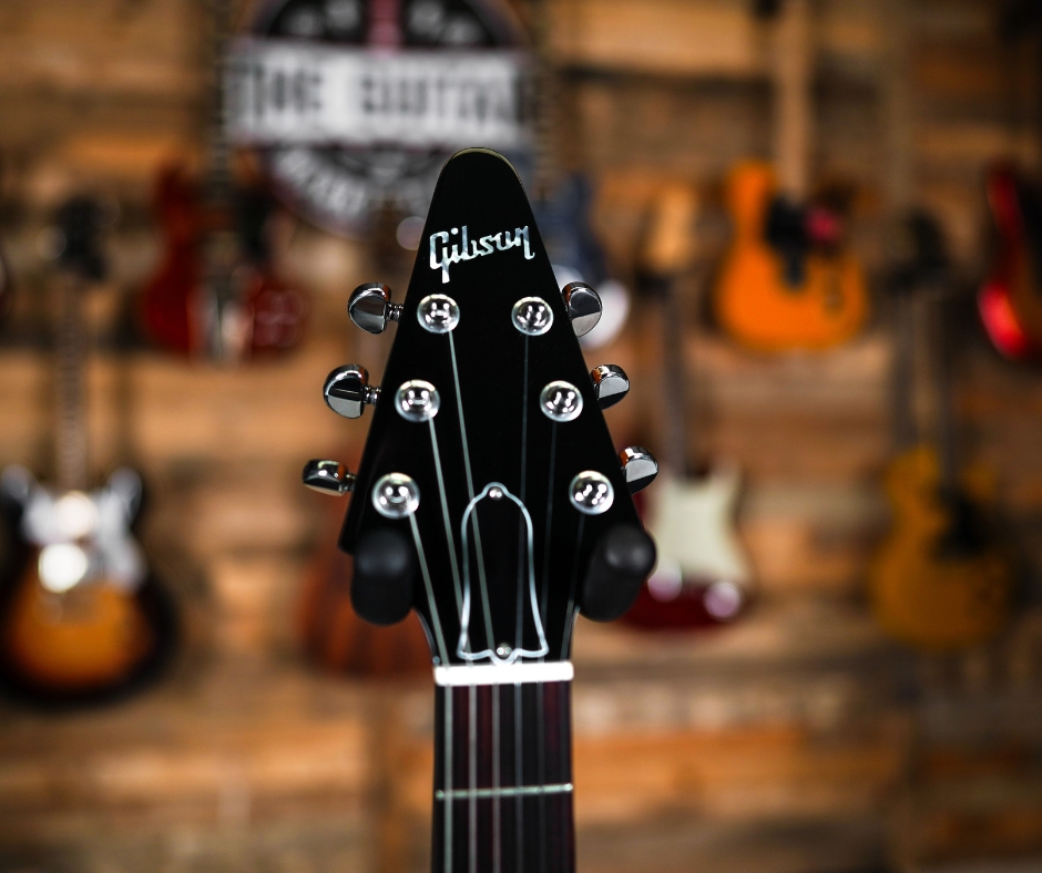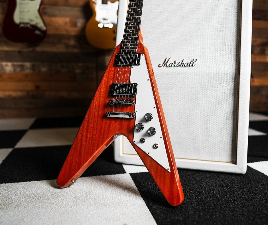 The Gibson Flying V in Antique Natural is an iconic rock and metal guitar known for its bold design, powerful tone, and effortless playability. Featuring a solid mahogany body, a SlimTaper neck, and high-output Burstbucker pickups, it delivers searing leads and thick rhythm tones with excellent sustain. The classic Antique Natural finish highlights the wood grain, giving it a vintage-meets-modern aesthetic.