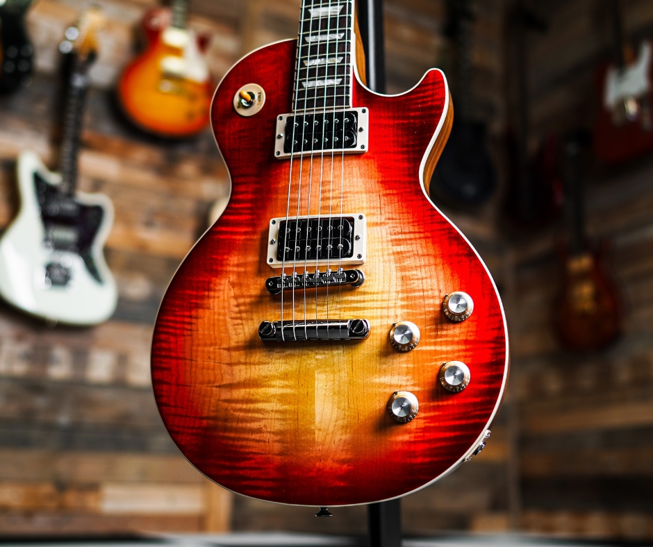 A modern take on a classic, the Gibson Les Paul Standard ’60s Faded in Vintage Cherry Sunburst delivers that iconic warm humbucker tone with a light satin-finish feel. Built with an AA figured maple top on mahogany, SlimTaper ’60s neck, and uncovered BurstBucker pickups, it blends vintage vibe and comfortable playability in a resonant, concert-ready solid body .