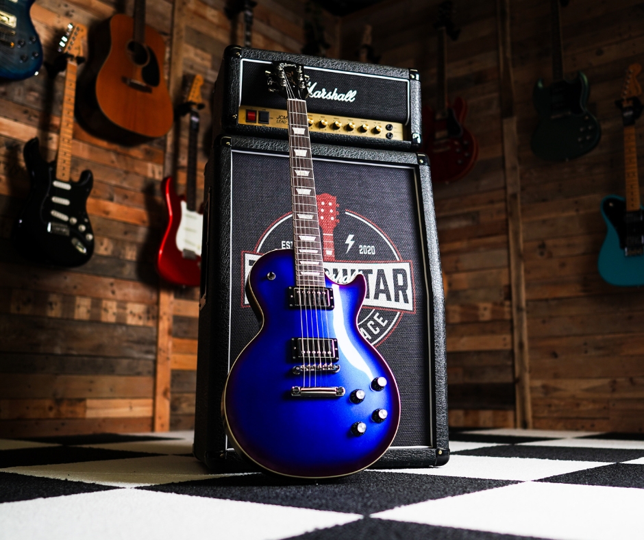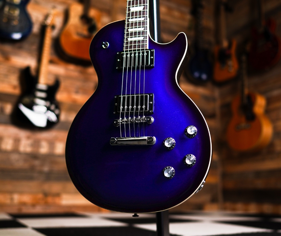 The Gibson Mod Collection Les Paul Standard ’50s in Nebula Burst is a one-off, custom-modified Les Paul featuring a stunning metallic purple to vibrant blue gloss finish on the carved maple top, contrasted by a satin ebony back and neck. Built in 2023, it combines classic ’50s-era construction with premium components and unique aesthetic modifications.