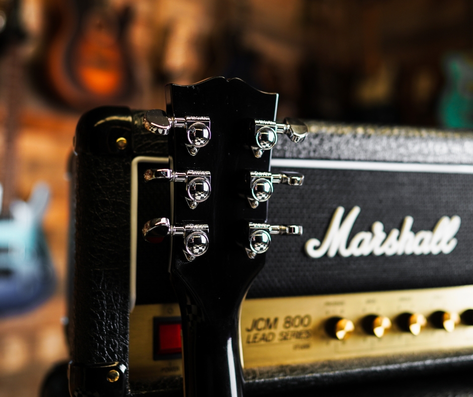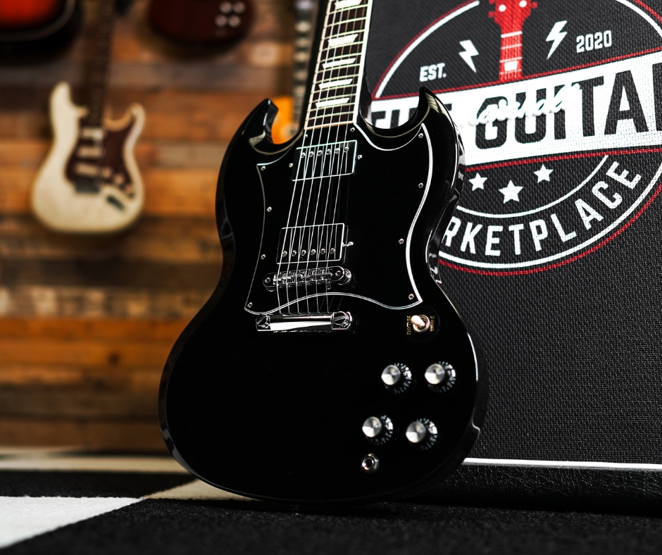 The Gibson SG Standard Ebony is revered for its lightweight, contoured body and powerful tone. Finished in a sleek gloss nitrocellulose Ebony, it offers a timeless aesthetic and exceptional playability.