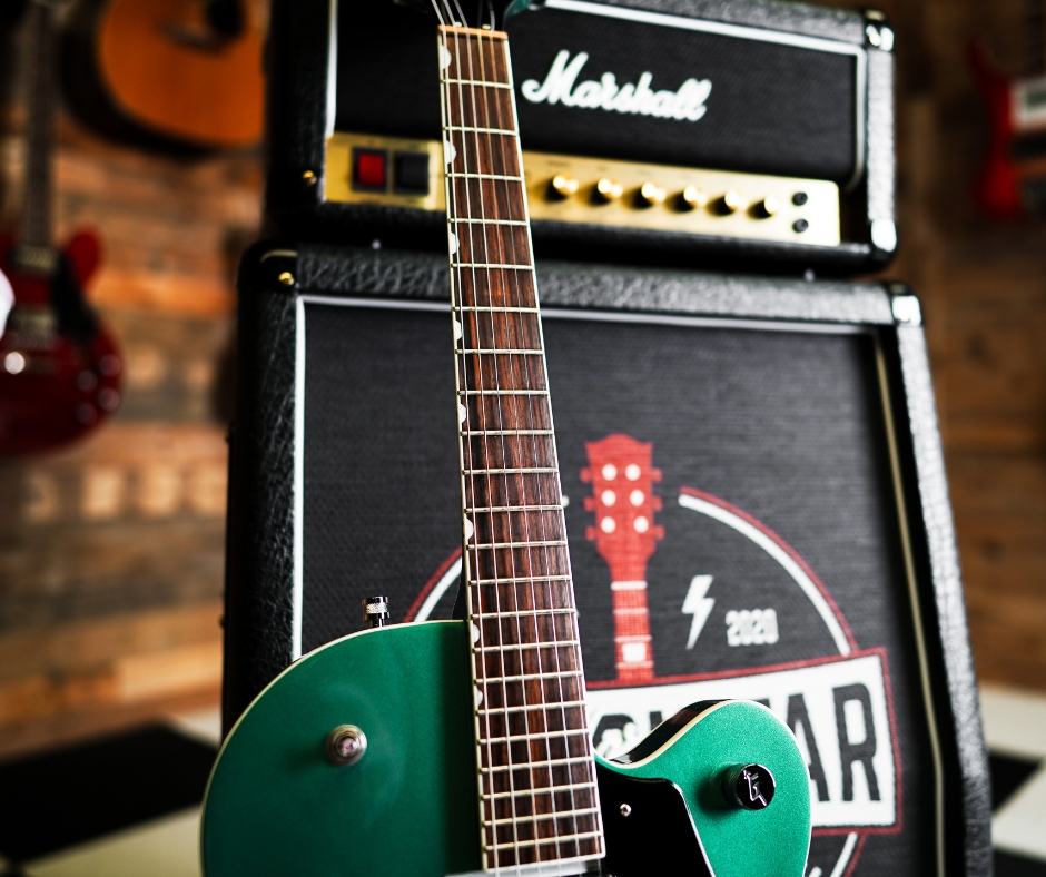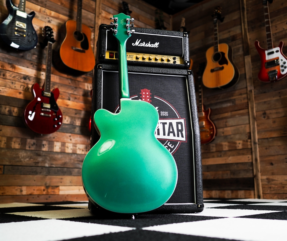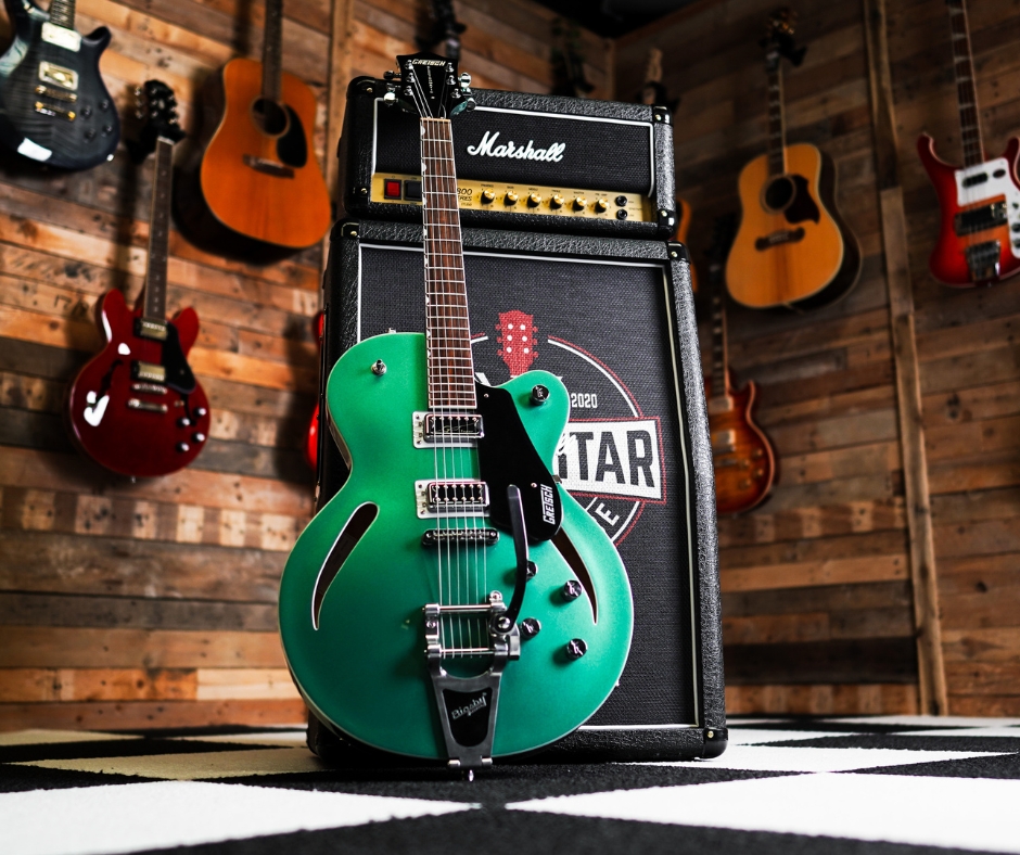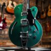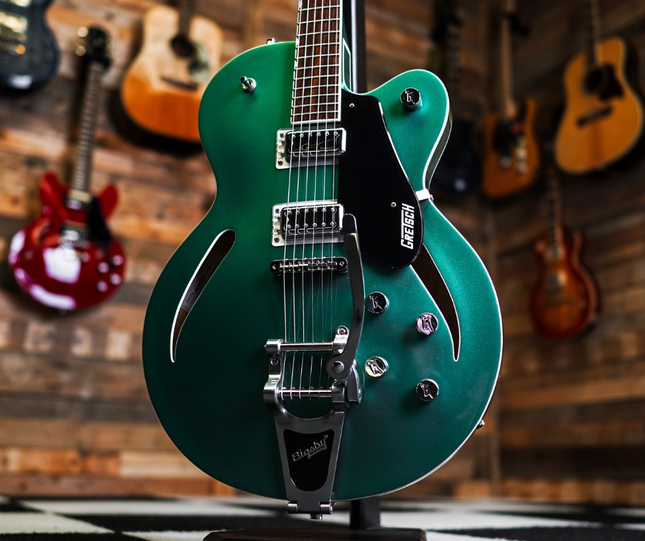 The Gretsch Electromatic G5620T‑CB Centre‑Block in Georgia Green is a single‑cut semi‑hollow powerhouse offering Gretsch’s iconic snap and clarity, enhanced by a full‑length spruce center block to manage feedback and drive high‑gain tones. Equipped with a Bigsby vibrato and dual-coil Super HiLo’Tron neck and Black Top Filter’Tron bridge pickups, it delivers chiming cleans and crunchy grit in a stylish vintage-inspired package.