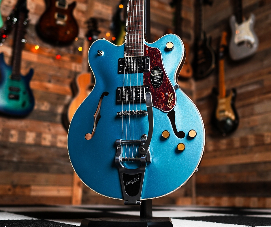 A sleek, double‑cutaway semi‑hollowbody with a chambered laminated maple body and arched top, this Streamliner model delivers warm resonance with strong attack and feedback resistance thanks to its center block design. It’s fitted with powerful Broad’Tron™ humbuckers, a smooth soft “C” neck, and a Bigsby B70 vibrato tailpiece for vintage‑style tremolo effects — perfect for rock, blues, indie, and beyond.