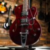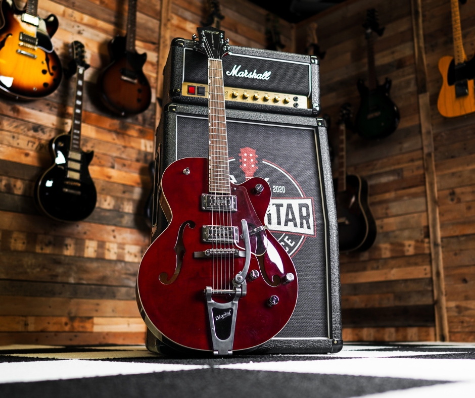 The Gretsch G5120 Electromatic Hollowbody in Deep Cherry Stain is a classic-style hollowbody with vintage Gretsch flair and modern playability. Its single-cut laminated maple body provides airy resonance and lightweight feelβpaired with dual chrome DualβCoil humbuckers and a Bigsby vibrato for that signature twang and shimmerβ―.