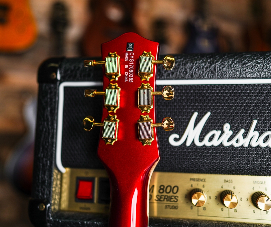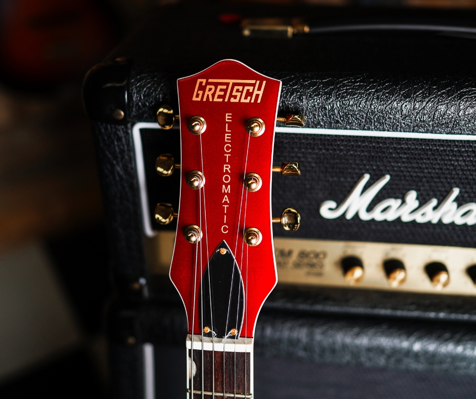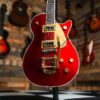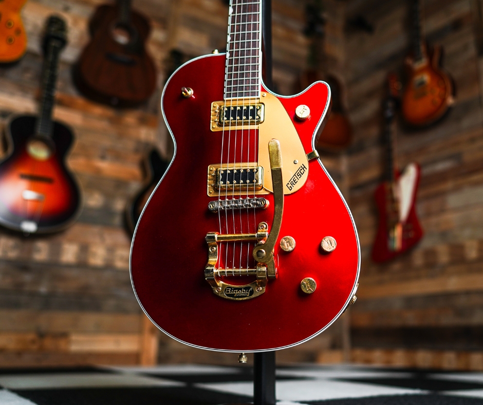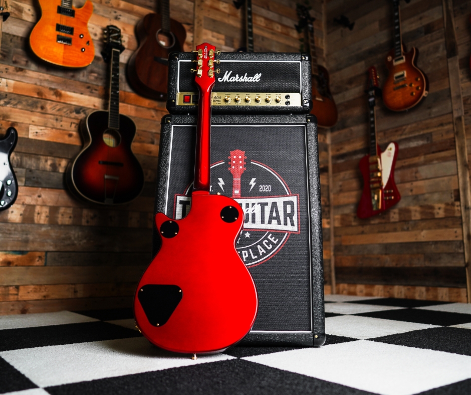 The Gretsch G5435TG Limited Edition Electromatic Pro Jet in Candy Apple Red is a dazzling “chambered” solid-body that delivers the high-octane “Great Gretsch Sound” with a serious touch of gold-plated class. Unlike a standard solid-body, the Pro Jet features a chambered basswood body with a maple top, providing a resonant, airy character that is more “semi-hollow” in its response.