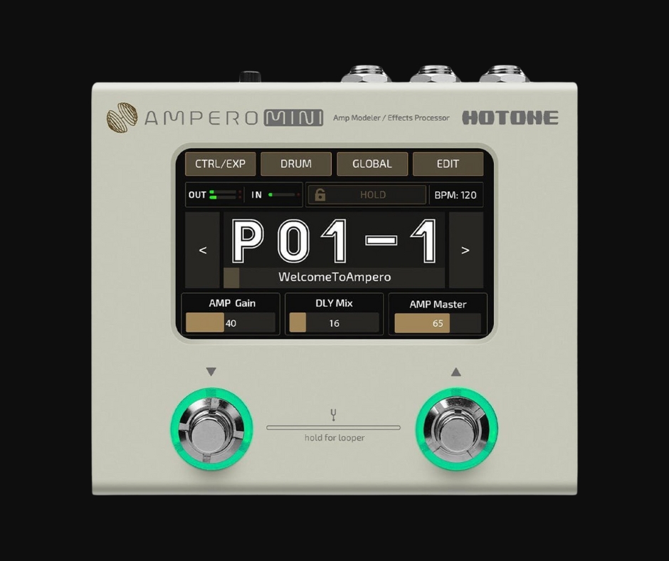 The Hotone Ampero Mini in Vanilla is a compact yet powerful multi-effects and amp-modeling pedal, delivering Hotone’s acclaimed CDCM & F.I.R.E. modeling technology in a sleek aluminum chassis. It features a vibrant 4″ color touchscreen, up to nine simultaneous effect modules, a built‑in looper and drum machine, and USB‑C audio interface capability—ideal for life on the pedalboard or on the go.