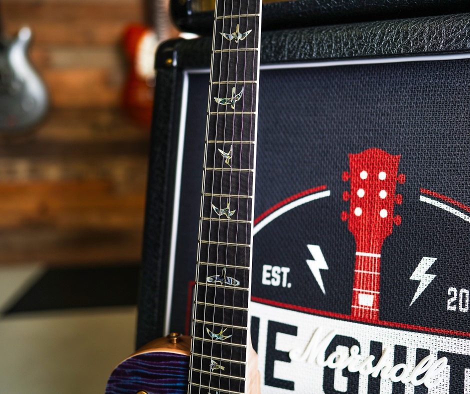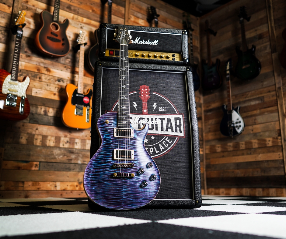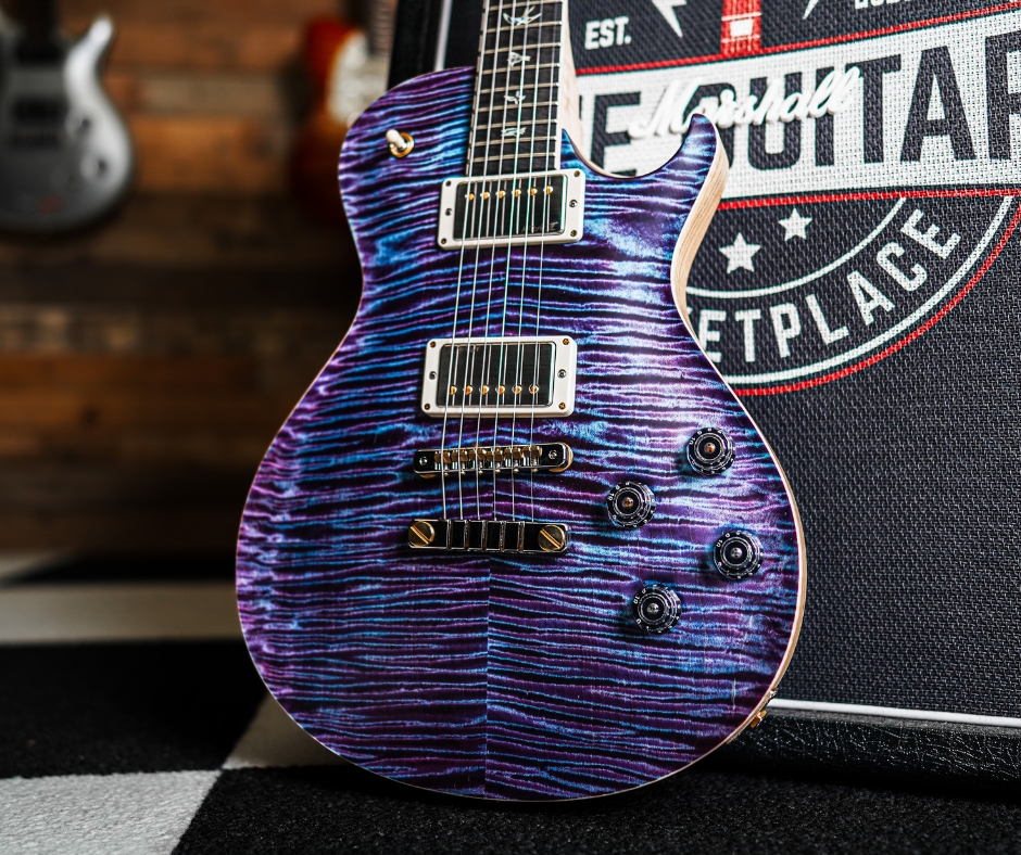 The PRS Wood Library McCarty 594 Singlecut 10‑Top in Violet is a stunning, limited-run instrument crafted under PRS’s Wood Library program. It pairs deeply figured “10‑Top” flame maple with a swamp ash or mahogany body, Pattern Vintage neck, and McCarty III humbuckers, delivering superb tonal depth and vintage-inspired versatility.