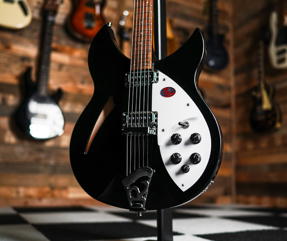 The Rickenbacker 330 in Jetglo is a modern‑classic semi‑hollow guitar known for its jangly, articulate character and classic rock pedigree. With its maple body, distinctive “R” tailpiece, and Hi‑Gain single‑coil pickups, it’s honed for rhythm and melodic lead work alike.