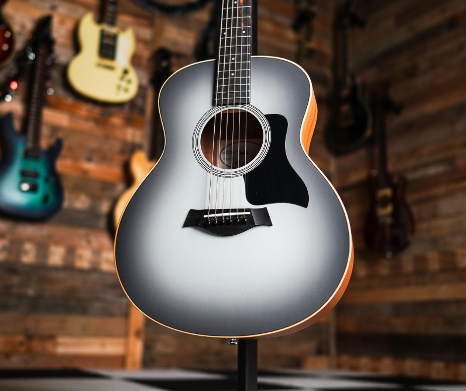 The Taylor GS Mini‑e Special Edition in Silverburst is a compact powerhouse—featuring a torrefied Sitka spruce top adorned with an ornate paisley graphic, layered sapele back and sides, and Taylor’s ES‑B pickup/preamp with built‑in tuner—delivering rich acoustic tone, striking aesthetics, and portability.